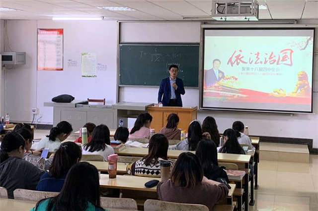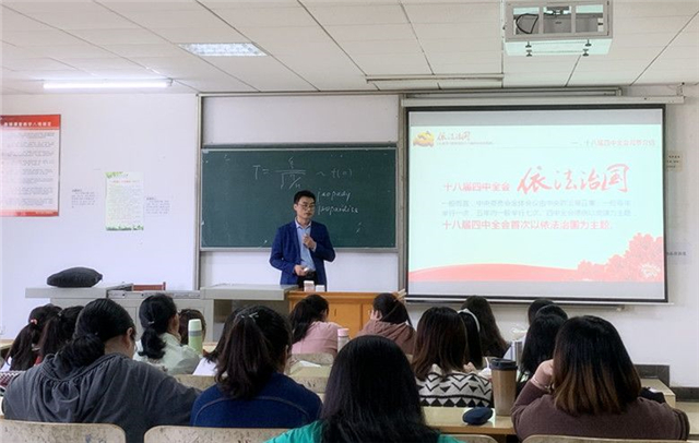 4月24日上午,法学教研室王国飞老师围绕以法治国主题,在2017级法学、英法专业开展“课堂育人三分钟”活动。他介绍了十八届四中全会召开的时代背景,讲解了改革开放以来“依法治国”发展路线图、全面推进依法治国的总目标、五个体系、六大任务和十八届四中全会的十大亮点等内容。同时,以十八届四中全会公报的内容引出课堂教学内容,使课堂专业教学与思政育人紧密结合。