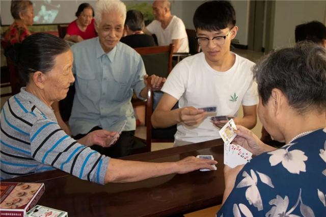午饭过后,有一个老爷爷拄着拐杖,颤颤巍巍地走到我们的旁边,让我们帮他看看他的儿子是不是把他拉到了黑名单,为什么电话打不通。我们用老人的手机尝试拨打电话,也是无果。但是用同学的电话却能拨通,最后联系上家人解决了老人的问题。这件事情正是体现了老人逐渐与社会发展脱节的问题。电子产品的使用不便,使得他们难以跟上社会的进步。老人已经是九十岁的高龄,儿子也接近六十岁,孙子也没有时间精力去教他们,爷爷就只能在有志愿员工来的时候寻求帮助。这让我们有了新的启发:我们之后可以将普及电子产品使用的活动带进养老院,让老人的晚年生活更加便捷。