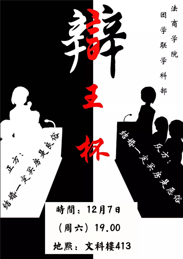 304永利集团一年一度的辩论赛就要开啦!!! 天气转凉,但是青春的气息依然火热。在这样的浪漫初冬,与并肩的同学一起进行思想的碰撞,智慧的延伸,给予老员工活浓墨重彩的一笔,又有何不可?期待两队8位选手精彩的交锋吗?他们的辩题是“结婚一定要买房,在当今是恶俗还是良俗”在雷敏、皮梦琪两位指导教练的带领下,究竟哪一方可以获得最终的胜利,捧起言王杯? 所以你还不心动吗?有朋友,有学分,有荣誉,有奖品,这样的辩论赛值得这样的你!