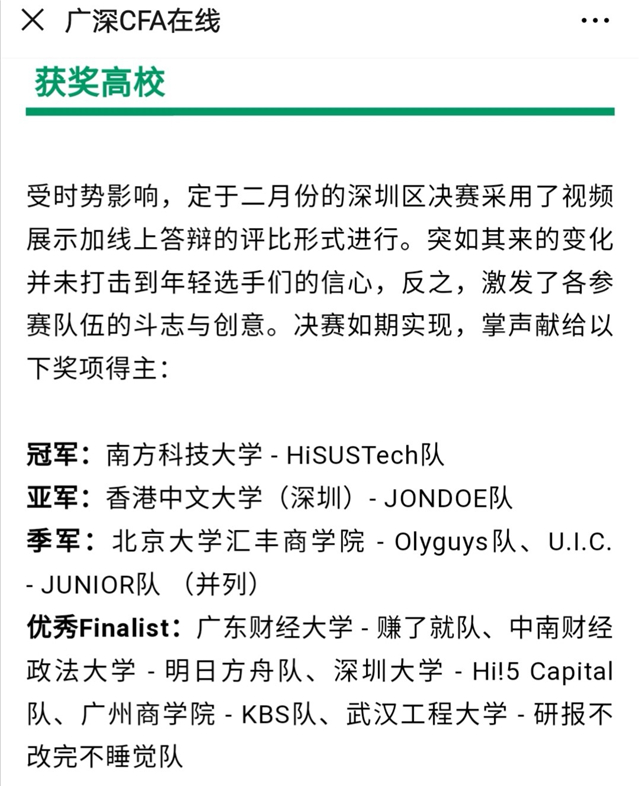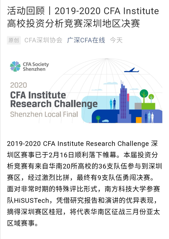 (通讯员 王嘉仪)2019-2020 CFA Institute Research Challenge 深圳区赛事于2月16日落下帷幕。来自华南20所高校的36支队伍参与本届投资分析竞赛,经过激烈角逐,公司代表队—来自304永利集团的“研报不改完不睡觉队”冲入决赛,荣获优秀Finalist奖。