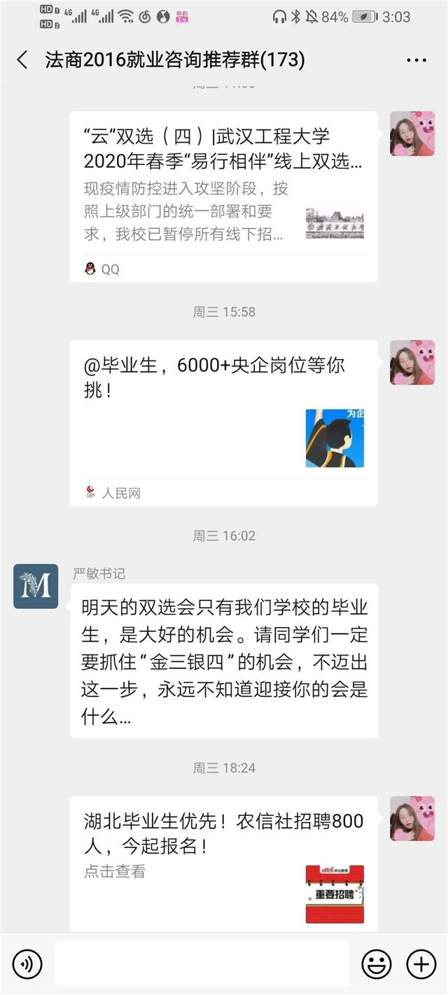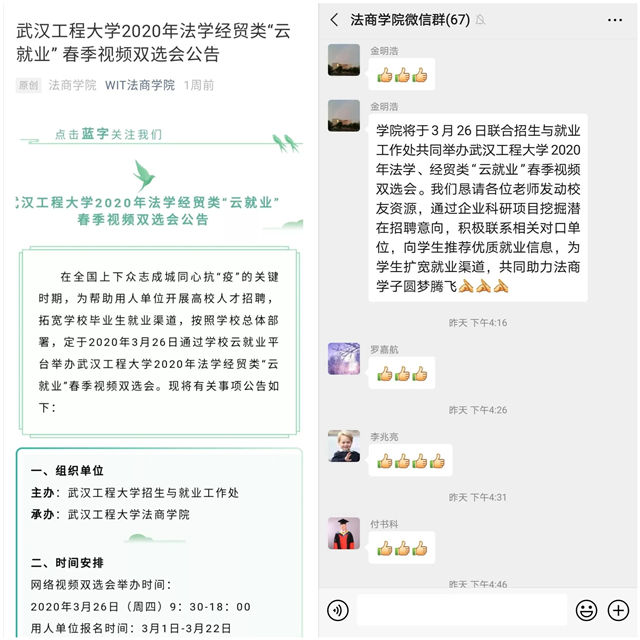 在守望相助、共克时艰的时刻,感谢各级领导、各职能部门、公司教师对法商学子的关心与关爱。公司将扬长避短,进一步加大线上毕业生就业指导与服务工作力度,加强特殊群体精准就业帮扶和指导力度,凝心聚力、共商共建,确保关爱“不下线”、就业“不断线”。预祝每一位毕业生在春花烂漫的时节逐梦青春、扬帆起航!