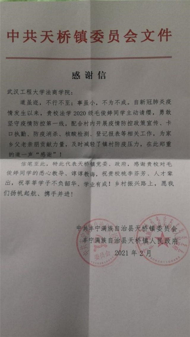 作为一名法学专业的员工,毛俊婷在志愿活动中主动开展普法宣传,打印宣传单,走到街头,走进村民家中,参与镇里的法制讲堂,向村民普及法律知识。用自己的专业帮助村民,用情怀书写初心,用热情拥抱未来。中共天桥镇向公司发来感谢信。