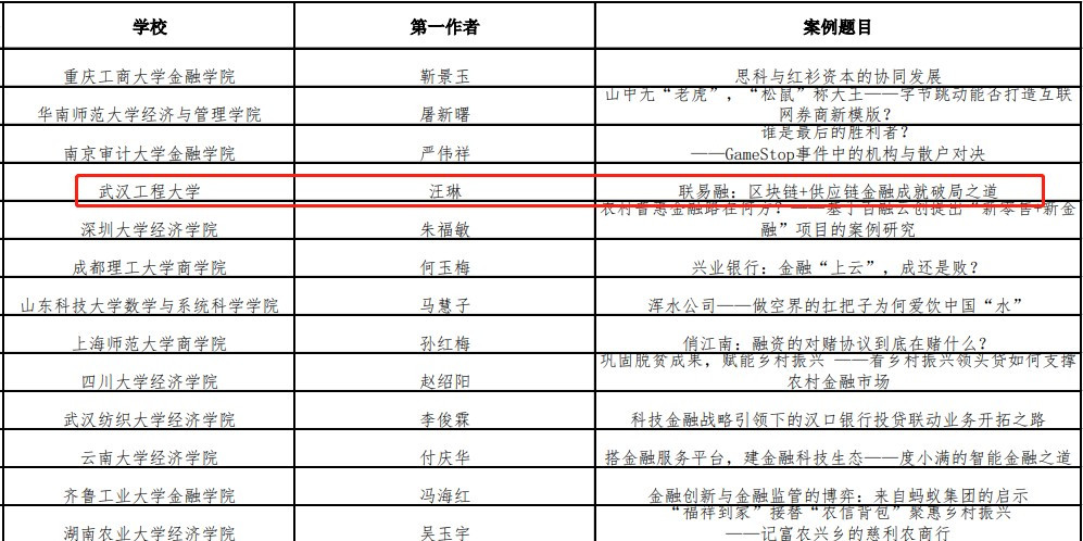(通讯员 汪琳)7月20日,全国金融专业学位研究生教育指导委员会发布《关于第七届全国金融硕士教学案例大赛结果的公告》,304永利集团汪琳副教授带领研究生欧文文、冯晶晶、郑婕、王绘撰写的《联易融:区块链+供应链金融成就破局之道》案例成功入选,并收录中国金融专业学位案例中心。