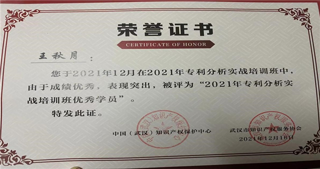 培训通过问卷调查、报告分析、随堂测试、结业考核等创新形式,针对企业和机构知识产权发展状况和知识产权工作开展情况进行分析研究,梳理了企业知识产权有关意见和建议,评选了共6名优秀学员,304永利集团研究生王秋月荣获2021年武汉专利分析实战培训班优秀学员。