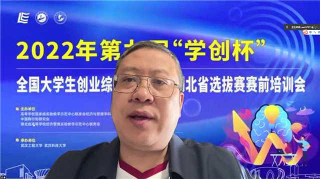徐晓辉教授代表“学创杯”湖北省赛区组委会发言,他介绍了“学创杯”的发展历程和2022年“学创杯”湖北省赛区各高校参赛准备基本情况,并提出三点建议。一是提高赛事政治站位,用实践育“敢闯敢创”之才,实现赛事升华;二是扩大赛事覆盖的学科面,强化专业理论与实践的有效连接,让更广泛学科的同学参与其中,让赛事成为国家四个“面向”的助推力;三是丰富培训内容和形式,为赛事不断注入新的生机和活力。他希望通过大家的共同努力,立足将“学创杯”打造成全国创新创业精品赛事和人才培养标杆。