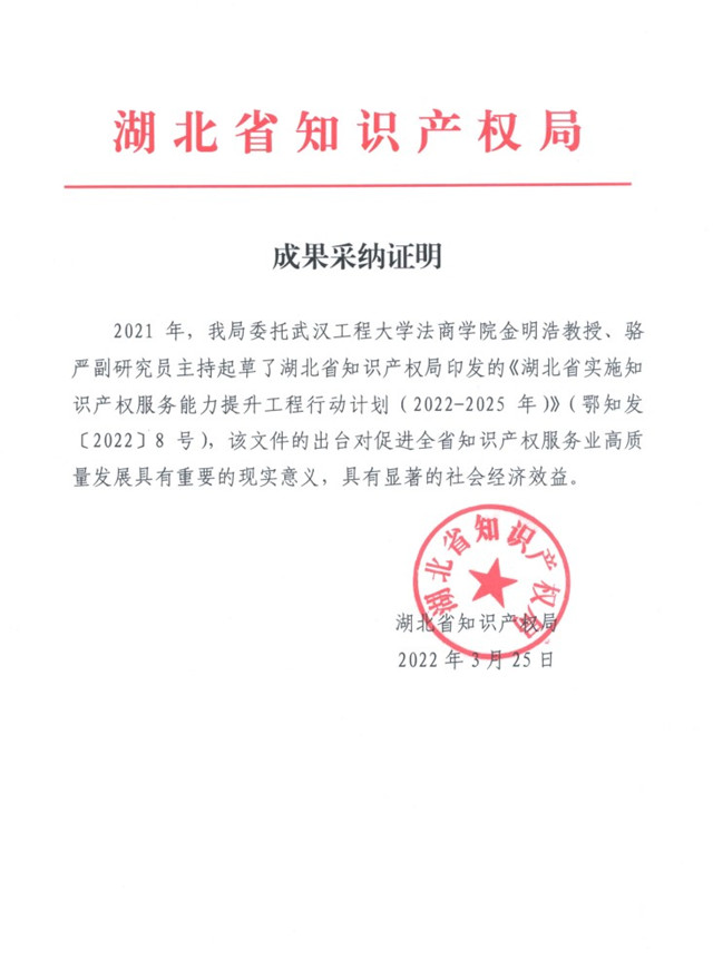 本网讯(通讯员 骆严)受湖北省知识产权局委托,公司金明浩教授、骆严副研究员主持起草了《湖北省实施知识产权服务能力提升工程行动计划(2022—2025年)》(鄂知发〔2022〕8号)。该文件出台对促进全省知识产权服务业高质量发展具有重要的现实意义和显著的社会经济效益。