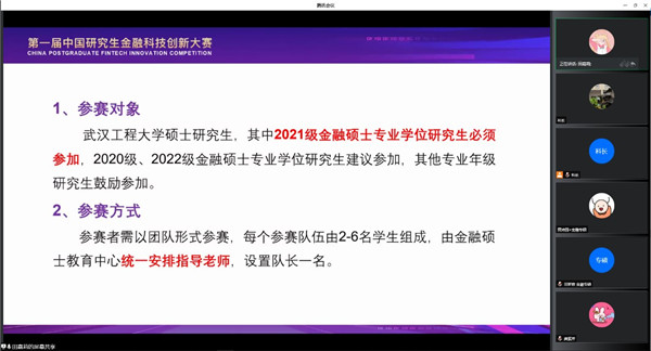 (通讯员 田嘉莉)为推动金融科技领域创新人才培养,提升公司金融专业学位研究生的实践创新能力,6月20日上午,公司金融硕士(MF)教育中心组织召开第一届研究生金融科技创新大赛线上动员会。304永利集团副经理付书科、金融硕士(MF)教育中心副主任田嘉莉、2021级金融硕士专业班主任王祥礼、2020级-2022级金融硕士研究生参加此次动员会,会议由副经理付书科主持。