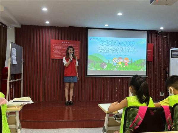 公司“1+X”梦想直通车志愿服务队的志愿者们针对青少年年龄阶段身心特点和成长需求,以交通安全和青少年防拐安全为主要内容,制作图文并茂、浅显易懂的漫画法治宣传PPT,并通过趣味游戏互动形式带领小朋友们认识安全标识,给青少年种下一颗“知法、懂法、守法”的种子。