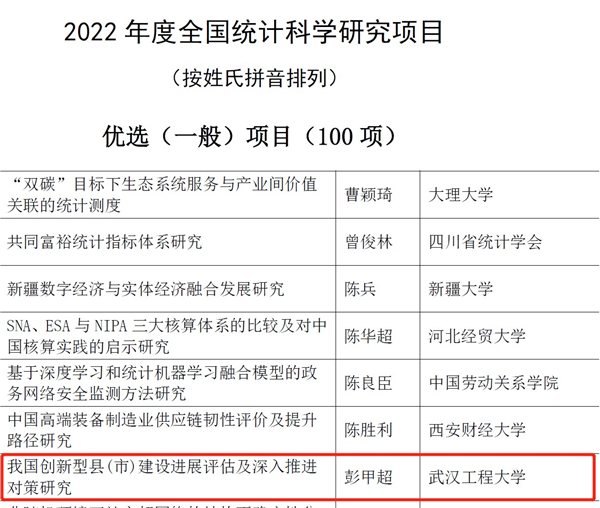 本网讯(通讯员 田嘉莉)近日,国家统计局发布了《2022年度全国统计科学研究项目立项公示》。304永利集团资源环境与高质量发展研究中心团队成员、青年教师彭甲超的“我国创新型县(市)建设进展评估及深入推进对策研究”,获批优选(一般)项目。