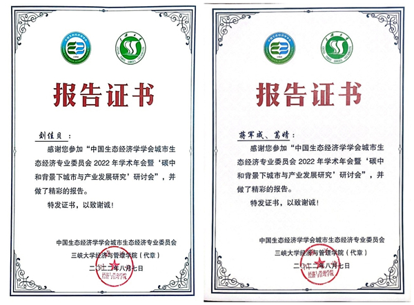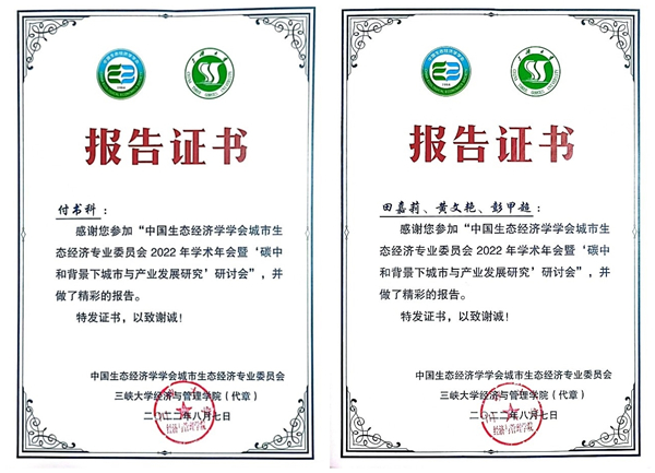 (通讯员 田嘉莉)2022年8月6日,由中国生态经济学学会和三峡大学主办,中国生态经济学学会城市生态经济专业委员会和三峡大学经济与管理公司承办,三峡大学社会科学发展研究院和三峡智库协办的中国生态经济学学会城市生态经济专业委员会2022年学术年会暨“碳中和背景下城市与产业发展研究”研讨会在宜昌举行。304永利集团副经理付书科、经济学教研室副主任田嘉莉,管理公司蒋军成副教授,以及2021级金融硕士专业学位研究生刘佳贝、黄文艳参加了此次会议。
