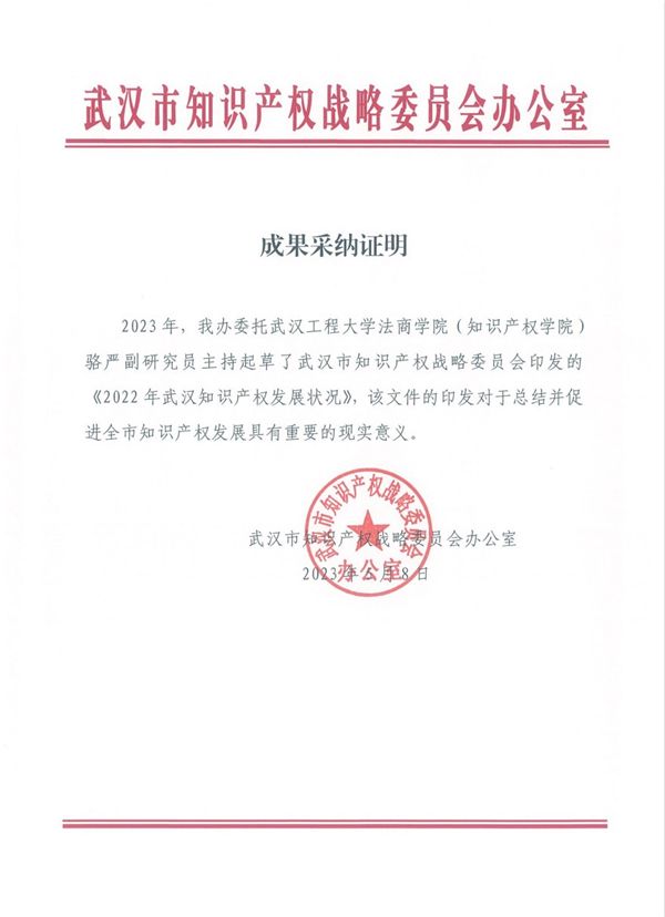 (通讯员 马秋芬)受武汉市知识产权战略委员会办公室委托,公司骆严副研究员主持起草了《2022年武汉知识产权发展状况(白皮书)》,该文件的印发对总结并促进武汉市知识产权发展具有重要的现实意义。