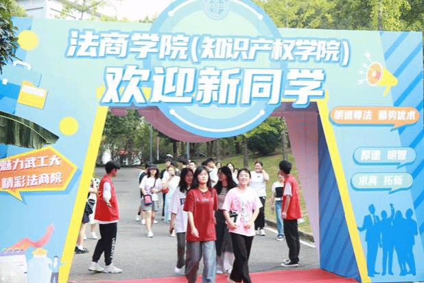 典礼正式开始前,富有法商元素的拱门与立牌,向同学们传递着独属于法商的热情与浪漫,新同学们依次通过红地毯进入会场。