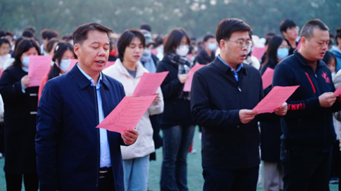 “我宣誓:忠于中华人民共和国宪法……”全体参与活动的师生面向宣誓墙,庄严的宣誓声响彻上空,回荡在每位老师、员工心中。
