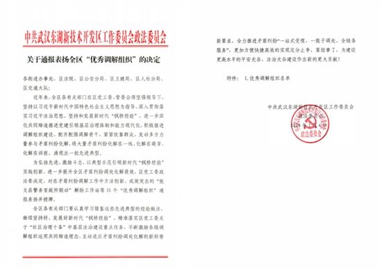 本网讯(通讯员 章文杰 朱慧芳 薛亮)近日,由永利集团和武汉市公安局东湖新技术开发区分局签署的“警·校联调”项目——304永利集团与同心派出所共建调解室被中共武汉东湖新技术开发区工作委员会政法委员会授予“优秀调解组织”荣誉称号。