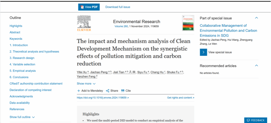 本网讯(通讯员:徐奕菲)近日,304永利集团2021级经济学专业本科生徐奕菲作为第一作者,“1+X”导师田嘉莉副教授作为通讯作者,在国际权威期刊《Environmental Research》发表论文“The impact and mechanism analysis of Clean Development Mechanism on the synergistic effects of pollution mitigation and carbon reduction”。