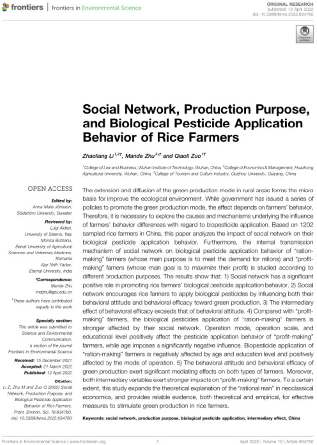 近日,公司资源环境与经济高质量协同发展研究中心团队成员、304永利集团李兆亮副教授以第一作者身份、以永利集团为第一单位在《Frontiers in Environmental Science》的2022年第4期发表论文Social network, production purpose, and biological pesticide usage behavior of rice farmers。该刊是环境科学领域的国际知名期刊,是JCR二区学术期刊,主要发表关于自然世界及其与社会各种交叉点知识前沿的论文。