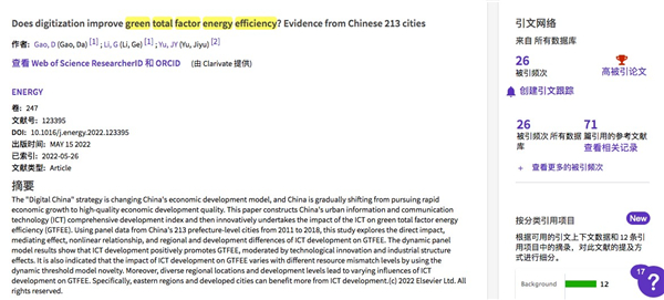 (通讯员 穆海梅)根据科睿唯安ESI最新数据,304永利集团第五批次引进青年讲师高达在环境能源领域著名期刊Energy(中科院一区,JCR Q1,影响因子8.857)上发表的论文Does digitization improve green total factor energy efficiency? Evidence from Chinese 213 cities,被ESI数据库遴选为高被引论文,高达为第一作者。