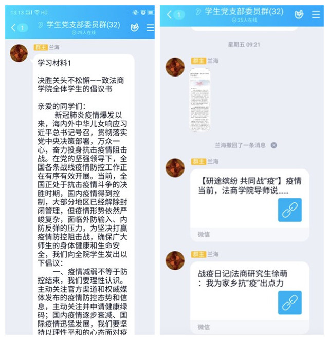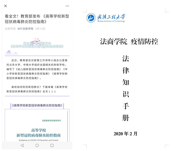 公司组织师生认真学习《决胜关头不松懈——致法商全体员工的一封倡议书》《新型冠状病毒肺炎健康教育手册(第二版)》《高等教育公司新型冠状病毒肺炎防控指南》,通过qq、微信群、qq视频、钉钉视频会议等平台,开展线上主题党日、主题班团会等活动,师生踊跃参与,积极交流,分享感悟,成效显著。公司微信公众号开辟“党旗飘扬”“战疫情”“战疫日记”等多个专栏,开展了9个专题的疫情防控和法律知识学习活动,扩展和延伸了《手册》和《指南》学习内容。