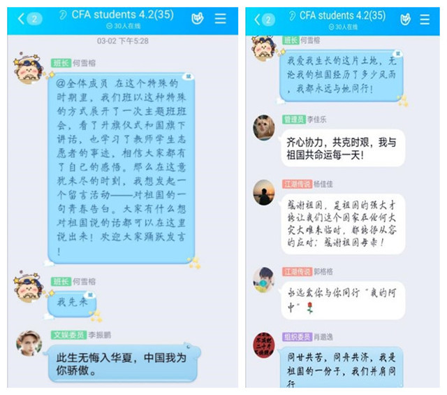 鲁程希:这次班会就像一只有力的大手,在疫情如此严峻的背景下,把我们经贸一班凝聚在一起。作为中国青年,我虽不具备上一线抗疫的专业素养,但疫情与我们息息相关。我们绝不能成为局外人,而要做力所能及之事,不信谣不传谣、积极配合社区,做好自身防护,不给国家添麻烦。