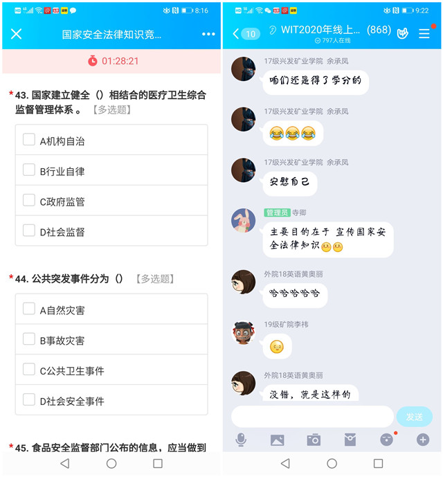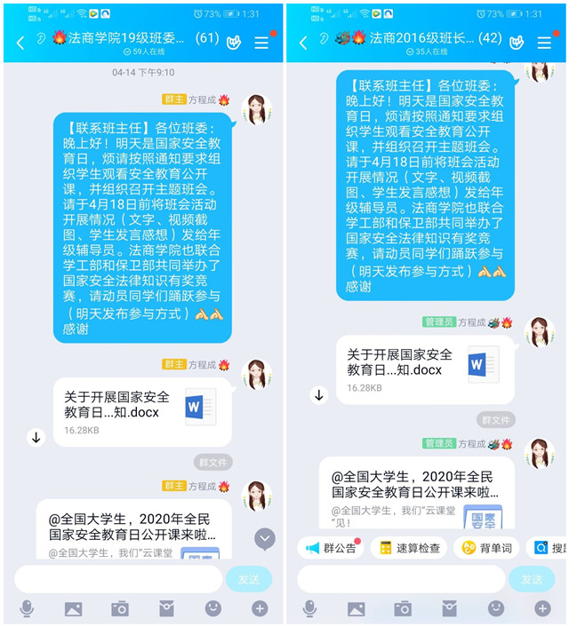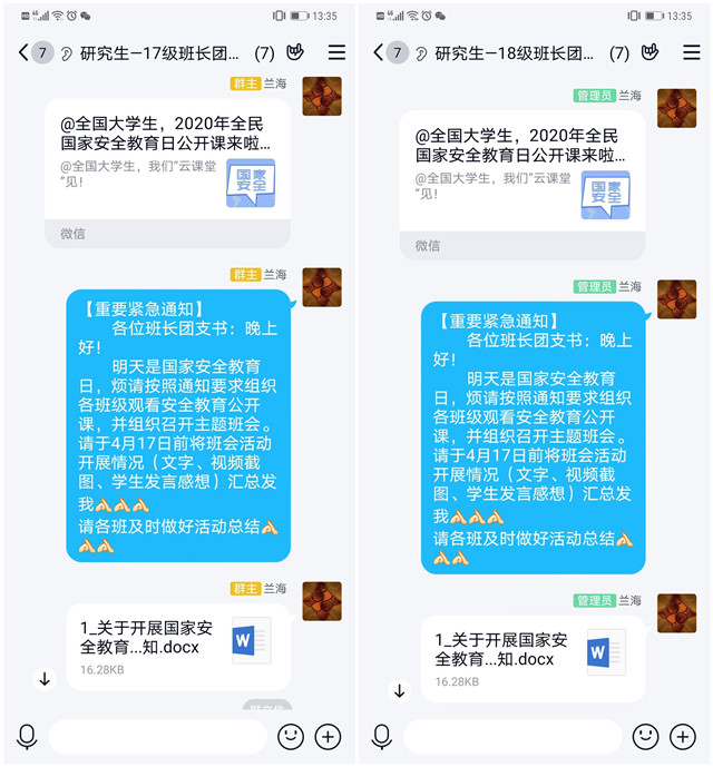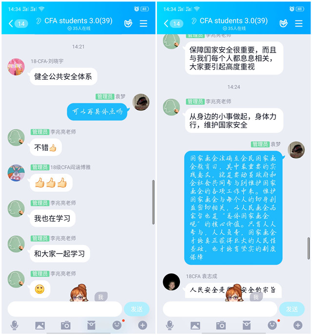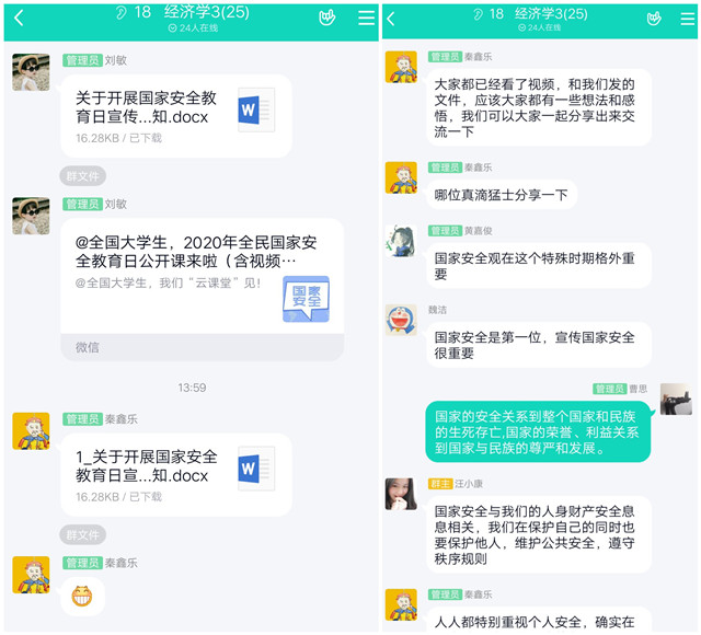 国家安全教育公开课学习结束后,同学们在班级群里结合范维澄教授抛出的“国家安全的定义是什么?面对疫情,老员工应该做什么?”这一问题进行踊跃发言、讨论。