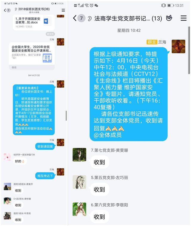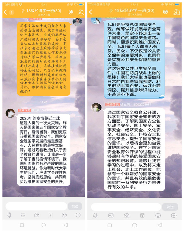 2017级国贸+法学1班 付兴宇:班会上,同学们一致表示,自己在以后的学习和生活中,一定继续认真学习国安方面的知识,做到知行合一。有国才有家,只有国家安全,才有个人安全,才有更充足的精力与能力投入到学习中。因此在以后的学习过程中,将继续努力上好网课,保质保量完成学习任务,争做新时代的好青年。