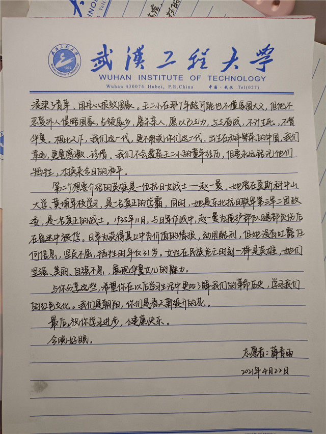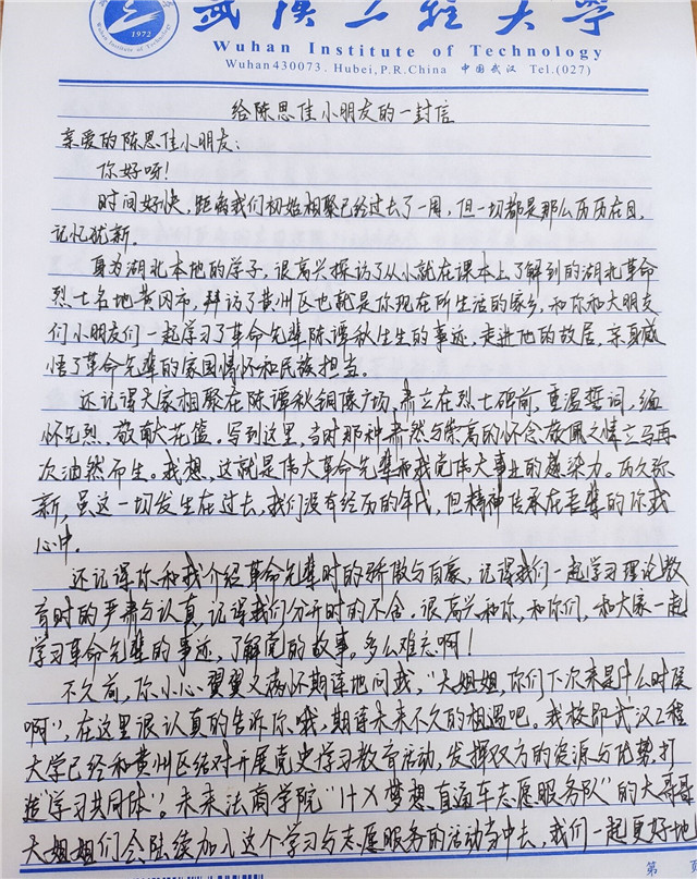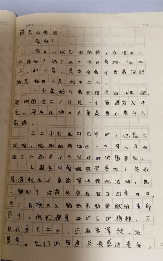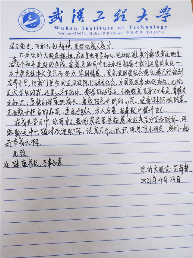志愿者范静慧在给小朋友陈思佳的信中写道:“很幸运能生在这个和平的年代,爱国早已深入骨髓,在感恩的同时,我们更要肩负起这个时代赋予我们的责任,好好学习、提高本领、勇于担当、乐于奉献,为中华民族伟大复兴贡献力量。”小员工陈思佳表示:“要好好学党史、知党恩、跟党走,将来为建设祖国贡献力量。”