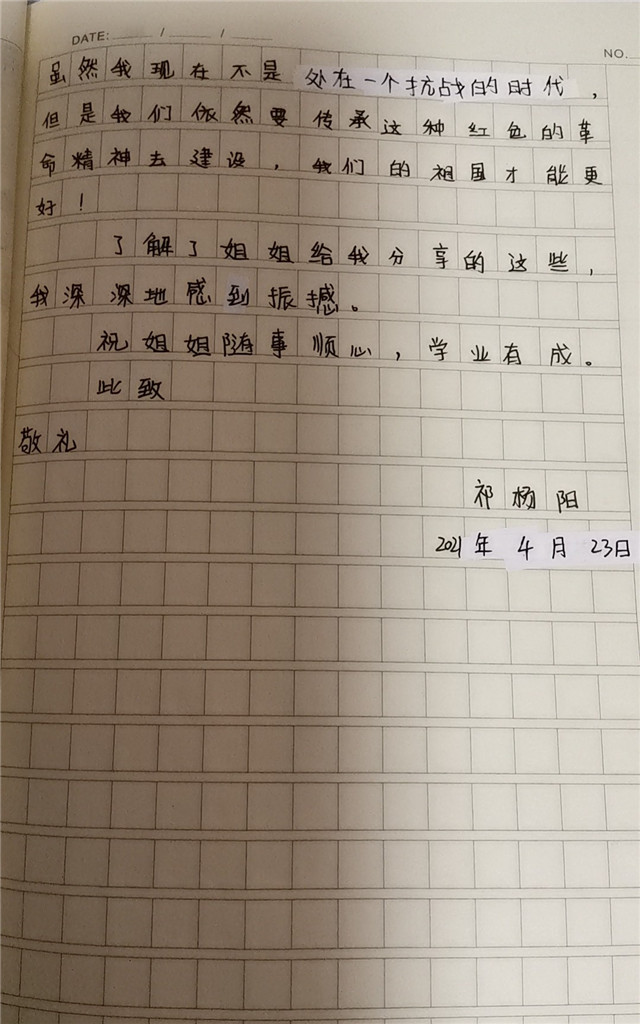 “姐姐,能和你一起学习好开心呀,你送给我的书我正在认真学习,我想给你看看我的读后感。” 志愿者薛青雨带着小员工祁杨阳的期盼与渴望,开启了他们的线上课堂。薛青雨在给小朋友的信中分享了她读红色故事的体会:“红色是太阳、是希望,是战争年代革命先烈的热血,是无数爱国志士的赤子之心;是鲜艳的五星红旗,是奋发向上的理想信念。我们出生在和平繁荣的中国,更要感激和珍惜。我们是朝阳,你们是春天绽放的花朵。让我们一起助力新时代、书写中国梦。”