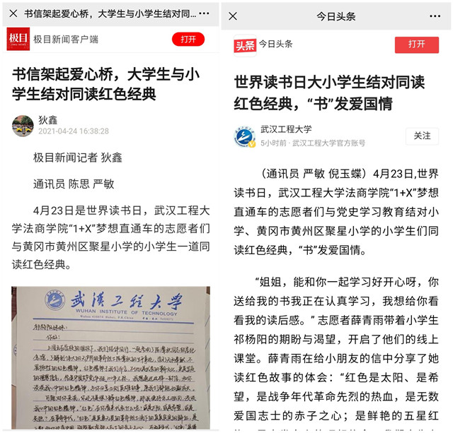 本网讯(通讯员 章文杰)4月23日,世界读书日,304永利集团“1+X”梦想直通车的志愿者们与党史学习教育结对小学、黄冈市黄州区聚星小学的小员工们同读红色经典,“书”发爱国情。湖北日报、湖北广电、楚天都市报、今日头条等媒体聚焦。