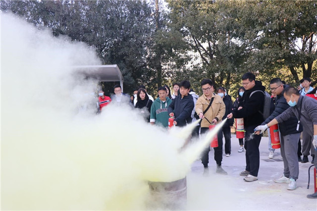 12月2日,公司组织全体2021级新生和各年级员工代表开展消防演练,邀请公司保卫处老师为同学们介绍常见火灾类型及防火、灭火知识,并现场讲解和示范灭火器、灭火毯的使用方法。在认真学习和观摩后,同学们亲自体验了使用消防器材灭火的过程,面对熊熊燃烧的大火,同学们表现积极且勇敢,按照示范步骤使用灭火器、灭火毯等工具将大火扑灭。实操过程中,保卫处老师针对具体操作细节进行了详细指导。