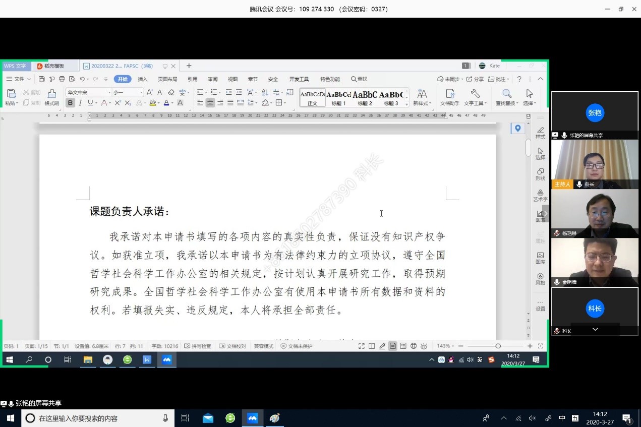 327日和28日,公司分别组织召开经济学(含教育学)、法学两个专题的国家基金申报专家线上咨询会,邀请来自重庆工商大学、华侨大学、武汉大学、中南财经政法大学、武汉理工大学、中国地质大学等8名知名专家,科发院刘治田经理和人文社科处赖小莹副处长参加了此次会议,会议由金明浩经理主持。专家们对公司20余份国家基金申报书进行了细致点评,提出许多中肯意见与建议。